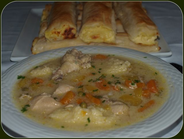 - piščančja enolončnica z grezovimi knedlčki; skutno-fetine palčke