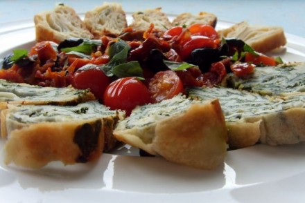 Danes je bila zelenjavna mineštra, pa od včeraj mi je ostalo nekaj zavitka, sem ga oplemenitila z nekaj omaki podobnega iz češnjevca, suhega paradižnika, oliv, vina, bazilike...