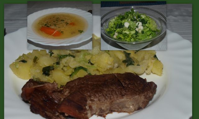 Goveja juhica; krompir na ohrovtu in česnu, popečena govedina iz juhe; zelena solata; jagode