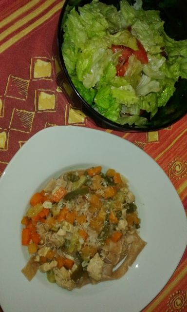 breskvalahko zelenjavna omaka s piščancem, široki pirini rezanci in dobra domača solatka...:)