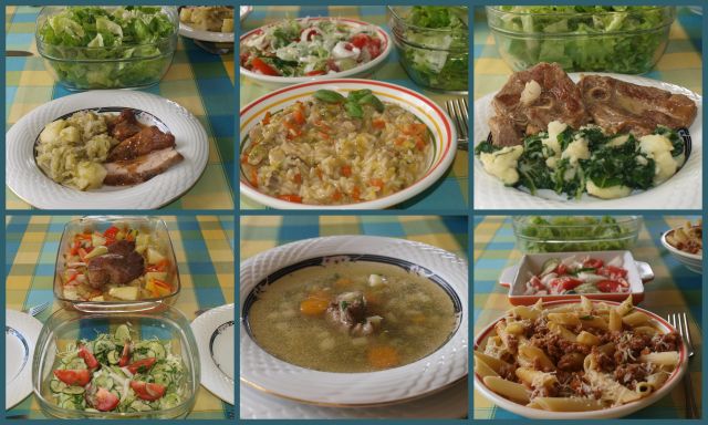 Danes: blitvina juha (je treba porabiti blitvo), pečene perutničke, beluši, kumare v solati, krompirjev pire, za posladek pa češnjevo skutin štrudl.