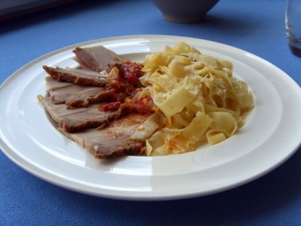 mopsikaDanes goveja juha z zdrobovimi cmoki, makaroni z mesno omako, paradižnikova solata, stročji fižol v solati