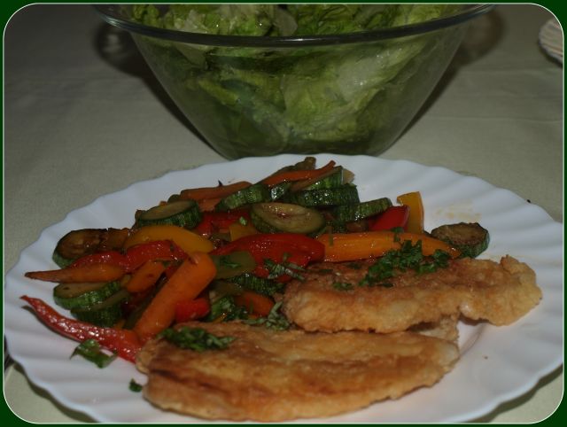 Zelenjavni mix v voku, po pariško panirani file ribice; zelena solata