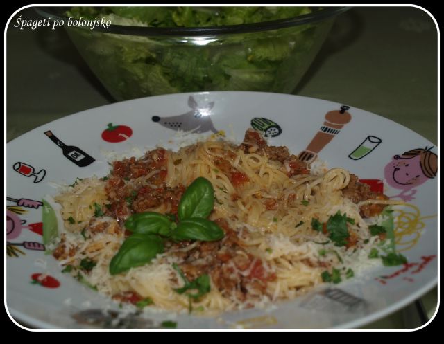 Danes: polpeti iz pečice, špageti na drobtinah, zelena in paradižnikova solata,jagode.