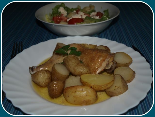 Pečeno piščančje bedro, pečen krompir, mešana solata