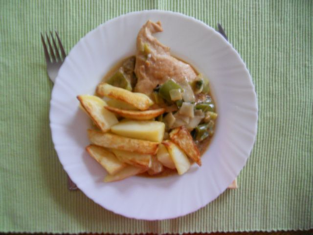 JohannaDanes: pečen krompir, puranji zrezki s porom in papriko, mešana solata