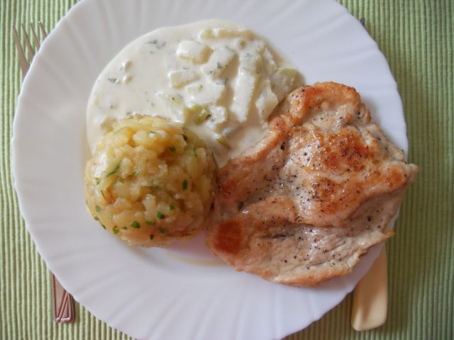 Danes: pražen krompir, puranji zrezki, kolerabica v omaki, mešana solata