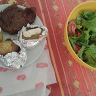Pečen krompir, goveji zrezek in obvezna domača solata. Po kosilu pa prija sladoled.