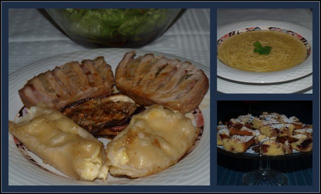 - Piščančja juhica; nadevan sv. kare, skutni štruklji, popečeni malancani s paradižnikom, posut s parmezanom; zelena solata; slivovo pecivo