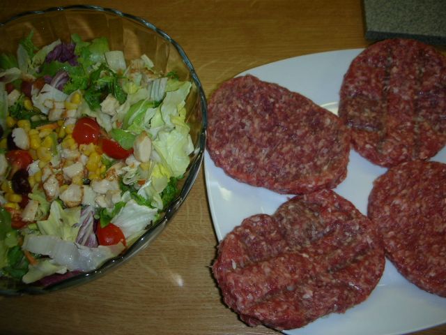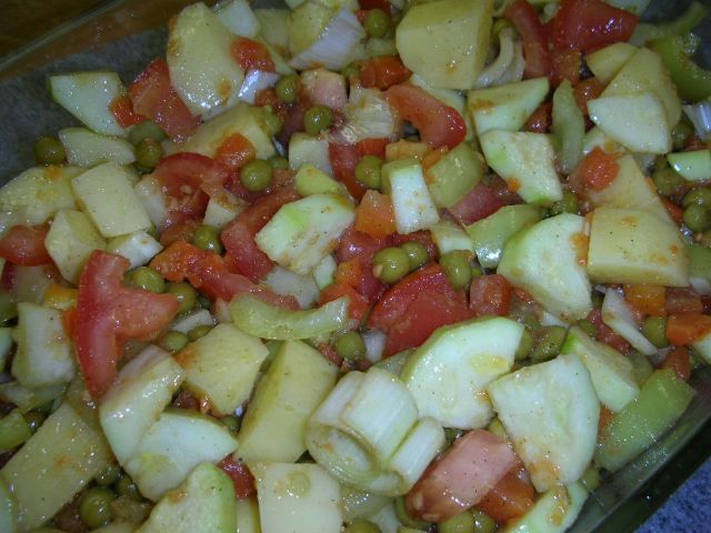breskvarižota s pišč. mesom, podlita s sokom filane paprike iz prejšnjega dne, zelena solata s česnom