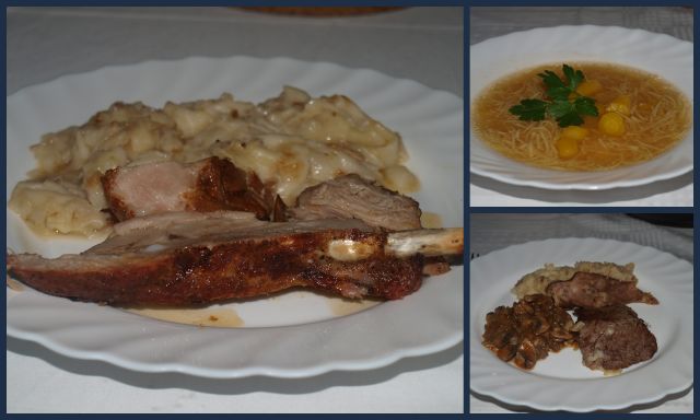 Včeraj - goveja juhica, puranja pečenka z dodatkom sv. rebrc, mlinci; danes vse našteto z dodatkom šampinjonov v omaki; seveda, oba dneva skleda zelene solate: