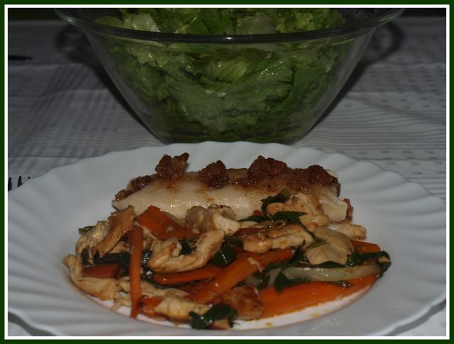 - Piščančji trakci z zelenjavo v voku, kuhan skutni štrukelj; zelena solata