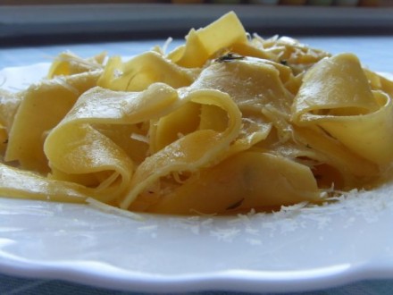 : široki rezanci (kupljeni) s česnom in limoninim timijanom