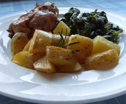 Nedelja: pečen piščanec, krompir z blitvo, šopska solata