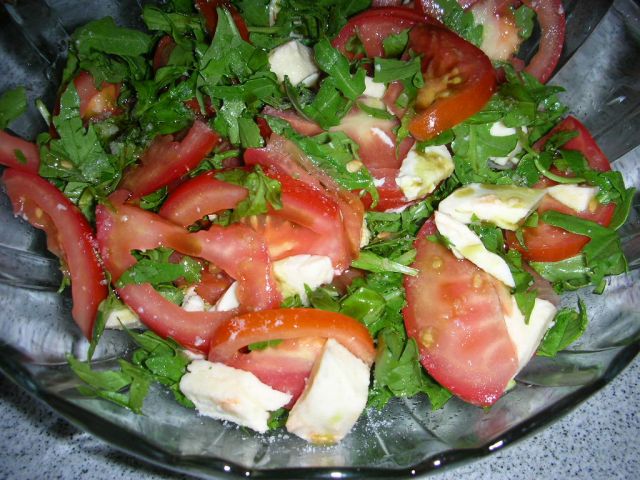 zelena solata s kumaro in paradižnikom, voda in teran, končno ![]()