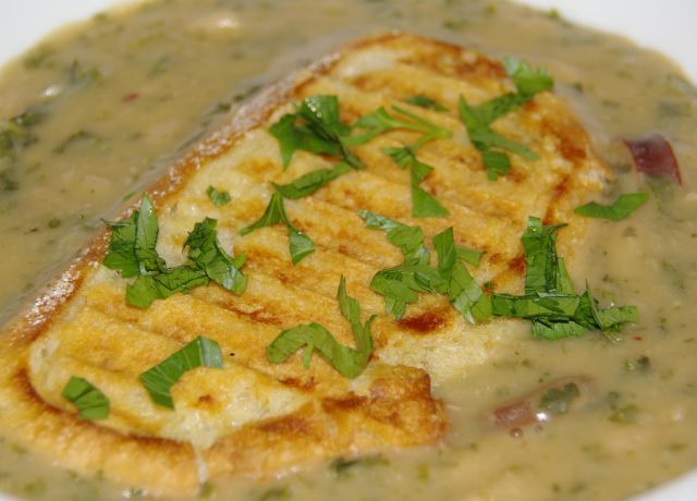 katka85Danes, ker je mrzlo kot hudir (20 stopinj celzija), kremna juha iz belega fižola z dodatkom kale in odišavljena s cajun andouille klobasico. na vrhu še popečen kos "sourdough bread" (a se reče kisli kruh???) rahlo namazan s česnom in posipan s parmezanom. Košček pite od včeraj. H2O.