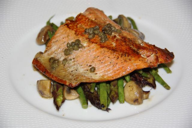 Danes: Asparagus, zelen fižol in gobe, vse popečeno in potreseno v začinjeni (kaj pa drugega) vinaigrette polivki. Čez 3 minutni losos s kaprami in žlico limonine omake.