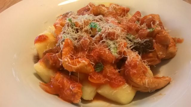 Njoki s paradižnikovo omako s puranjimi prsmi in zelenjavo. Za sladico pa mangova strnjenka.