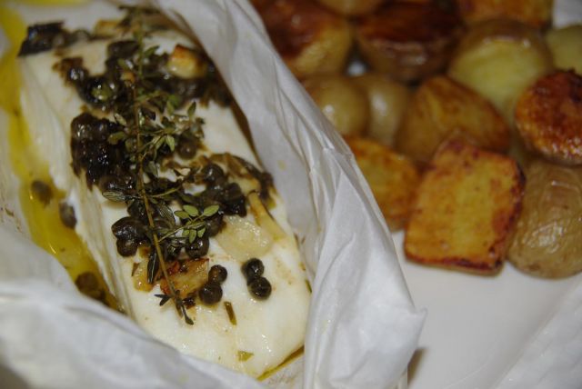 Oha yeah, baby! Halibut s kaprami, česnom, timijanom in baziliko z limono v peki papirju. Poleg minimalističem mini krompirček iz pečice. Pred tem zelen fižol v solati. Lubenica za desert.