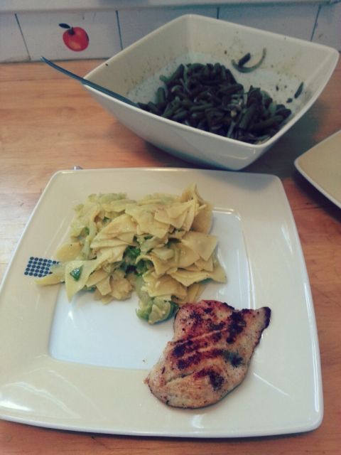 Danes: zeljne krpice in pecen piscancek z strocjim fizolom v solati :)