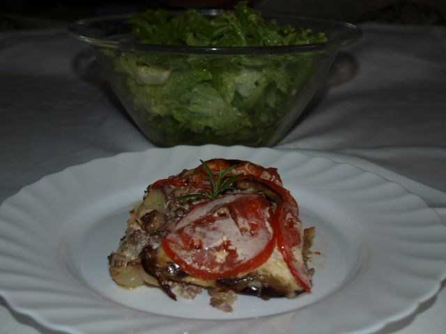 Musaka (pečeni malancani, pečene paprike, krompir...), zelena solata: