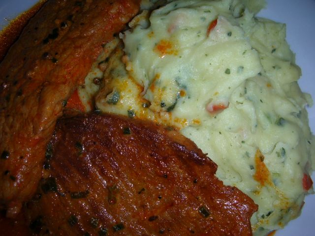 pire krompir z brokolijem, korenjem in drobnjakom, svinjski kare z gorčico in čisto preveč paprike se mi je notri vsulo, smo pojedli vse
