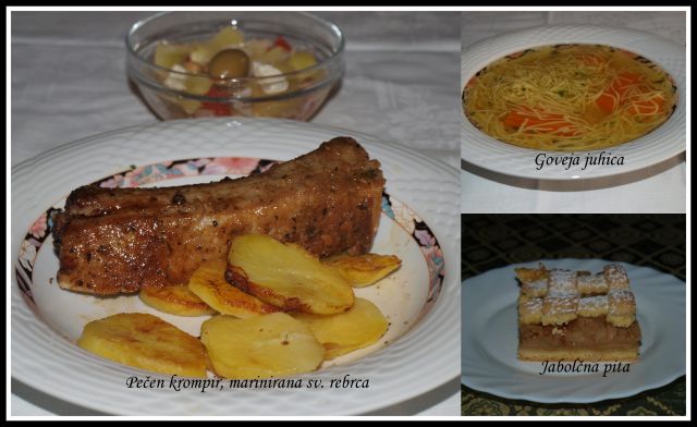 Tako, danes pa še juha od včeraj, solata s krompirjem, mož še rebrca od včeraj. Hvala bogu, da so ponedeljki v tednu, ko lahko malo improviziram.
