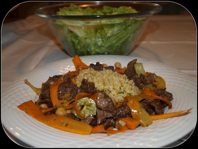 Goveji trakci z zelenjavo v voku, burgul na česnu; zelena solata