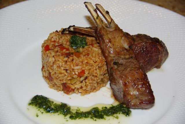 Sreda: Špansko odišavljen basmati riž z zelenjavo, ovčji kotleti samo s soljo in poprom, z meto in česnom odišavljeno olje. Poprej malo solate, nekoliko kasneje kos jabolčnega zavitka od včeraj. Še za 2x ga je. :)