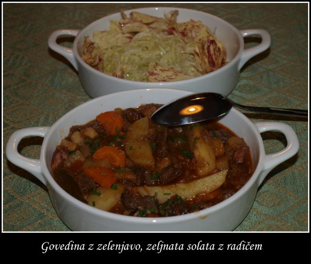 nedelja, malo po angleško; roastbeef z zelenjavo, ki sem jo na kocu spasirala v omako, in yorkshire pudding (celo uspel mi je ...):