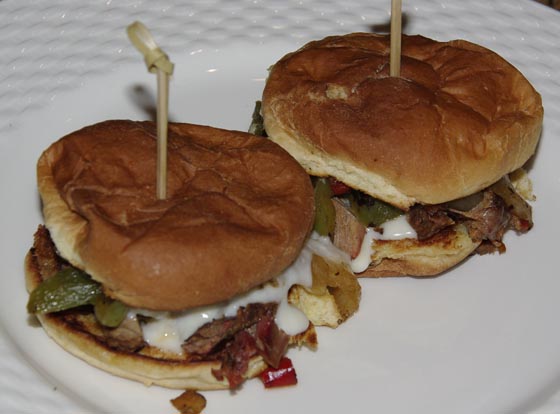 mojezlato http://kosilazavsakdan.blogspot.com/Danes: Ker je bilo treba porabiti kruhke za mini sendviče, v zmrzovalniku sem odkrila dimljeno govedino od par mesecev nazaj, popekla po pol zelene, rumene in rdeče paprike ter čebulo na žaru, naredila sirovo omako in vse sestavila v krasne sendviče, ki se jim tukaj reče "sliders". Jasno, da sem kruhke tudi popekla. :) Poleg pivo in H2O. Za desert pogača iz ricotta sirčka in borovnic.