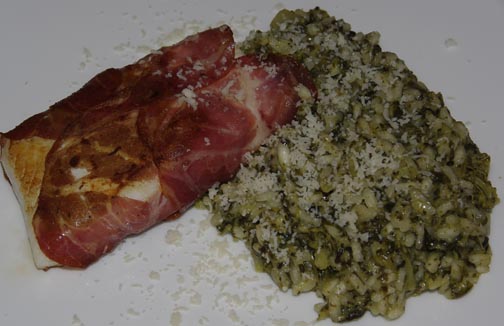 Danes se gremo "zelene": Za solato: broccoli kremna juha (samo broccoli in piščančja juha ter dodaten česen, timijan, malo soli, popra in kajensko papriko) z razdrobljenimi popečenimi (v panini toasterju) koščki kruha, premazanimi s česnom. Potem riž po principu rižota s špinačo in brokolijem. Halibut ovit v pekočo bržolo, nariban parmezan za lepšo sliko. ![]()