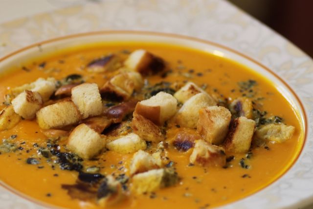 mojezlato http://kosilazavsakdan.blogspot.com/Kremna bučna juha s popečenimi kruhovimi kockami.