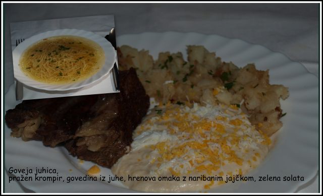 Danes: goveja juha z rezanci in zlatimi kroglicami,   pražen krompir,  govedina iz juhe,