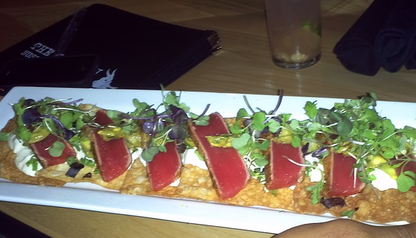 Pri nas je pestro: Včeraj se je romantična večerja v dvoje začela s: tuna sushi nachos (Sem zavila oči, ko sem prvič za to slišala, ampak niso to nachoti: pohani wontoni, malo rakovičjega namaza, gor tuna, povrhu guacamole in okrasno zelenje) Ena boljših stvari, ki sem jih kdaj jedla. Od tod je šlo vse navzdol: Buffalo sushi (brez sojine omake) bi bil super, če bi bil dimljen in ne odišavljen s tekočim dimom. Angus govedina v sushi rižu je bila presuha, okus pa super (kot bi jedel govedino in riž, samo da je lepo zavito, z malo pekoče majonezaste omake). Koktejl zame, šofer je bil zadovoljen kar z ledeno vodo. Doma pošten kozarec za nazdravje. :)