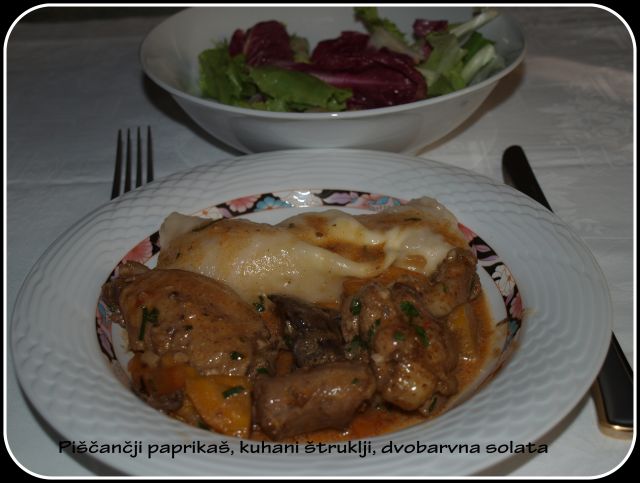 , žrebičkovi zrezki v omaki, zeljna solata, gužvara
