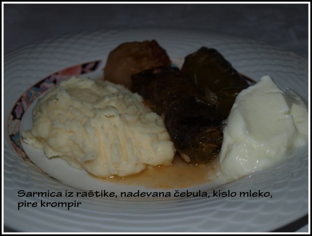 Goveja juhica z domačimi rezanci, sarmice iz raštike, nadevana čebula, kislo mleko, pire krompir