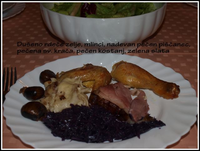 danes pa mešana solata (radič,zelje,koruza), pečen sv.meso (nevem še al v pečici al dunajski-se še odločamo), pečen krompir (najprej pokuhan, nato popečen), pečen puding za sladico