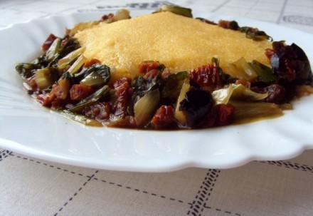 polenta s tršimi listi endivije, suhim paradižnikom, olivami, česnom in začimbami
