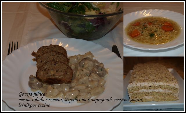 Danes je bilo kosilo v rimljankinih koncih: goveja juha z ribano kašo, govedina iz juhe, puranja rolada, pire ![]()