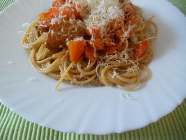 Danes: dušena govedina v korenčkovi omaki, polnozrnate špagete, solata, malinine rezine