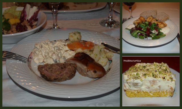 Včeraj smo imeli za kosilo le govejo juho z vlivanci, nato pa zgodnjo večerjo- škampov koktail, hobotnica v solati, losos v testu, narezek, francoska solata, čokoladna torta in piškoti. Upam, da mi hči pošlje še slikice....