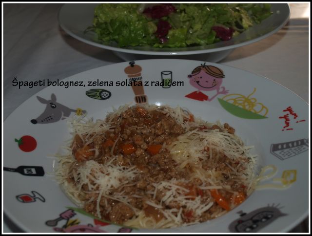 Danes mesna omaka in testenine, mešana solata in sankanje![]()
