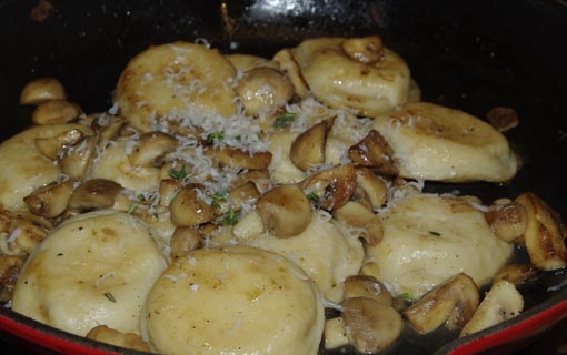 NENA58Danes: Kremna juha iz paradižnika in popečenih paprik in brez smetane. Skutini ravioli na popečenih gobicah, česnu in timijanu za dva, zame cukini pasta, prav tako na gobicah. Berivka z avokadom in vinaigrette polivko.