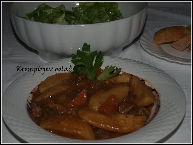 Krompirjev golaž, koruzni kruh, zelena solata: