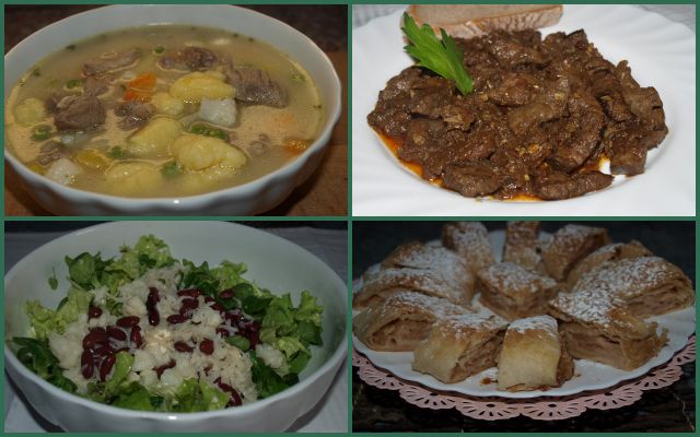 Telečji ajmoht (ostalo od včerajšnje večerje); pražena jetrca, solata - zelena, motovilec, cvetača, fižol, črna redkev; jabolčni zavitek