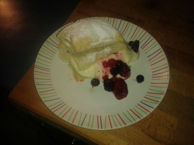 mojezlato http://kosilazavsakdan.blogspot.com/Danes pohan piščanec, pire krompir, zelena solata z jajci in sladička iz slistnatega testa z vanilijevo kremo in sadjem.