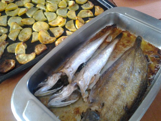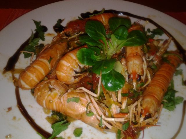 Včeraj potep po tržnici - pa sem prišla do osliča, zraven morski list in škampovo razvajanje: