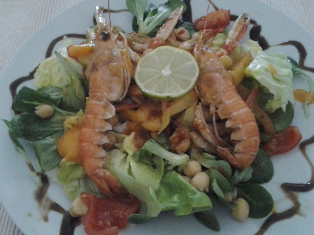 Danes zame v ingverju in čiliju začinjeni pečeni gamberi in škampa, paprika, mlada čebula in solata s čičeriko...