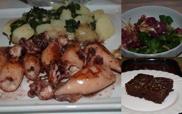 Praženi kalamari, krompir na česnu in blitvi, motovilec in radič; kakao kocke